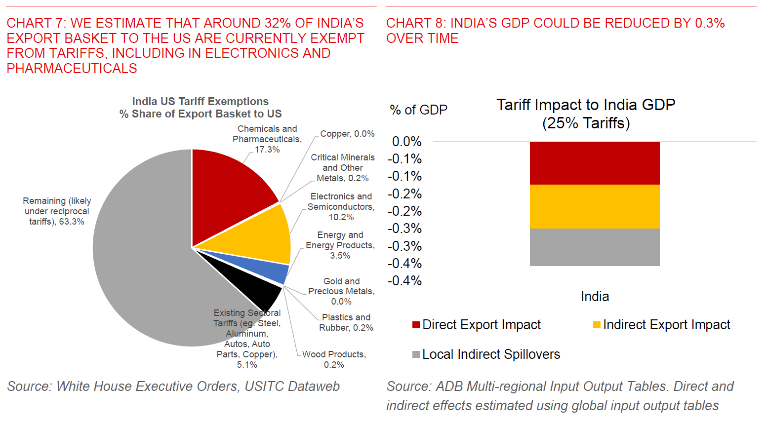 Taking all these into account, we estimate that India’s GDP could be reduced by around 0.3pp over time, and assuming that sectoral tariffs of 25% eventually fall on India’s electronics and pharmaceutical sectors. These effects could be larger if tariff differentials stick, and the US could conceivably substitute to India’s alternative supply sources across India’s export competitors as our analysis above shows. In our base case, we assume that India strikes a deal with the US and lowers its tariffs to 20% by October 2025, but importantly tariff uncertainty will remain a headwind in the meantime.