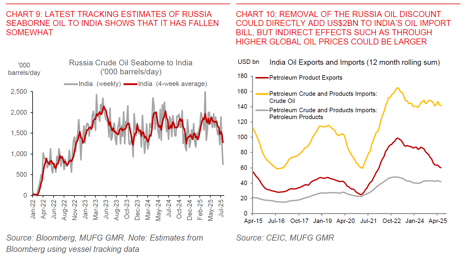 The additional complication for India is the unspecified penalty for India for its purchases for Russia oil and military equipment as stated by Trump. The best estimates shows that India imports around 35% of its oil from Russia, although some of this also gets processed into petroleum products such as diesel and likely gets sent to other regions including Europe (see Chart 10 below). With the Russia oil discount now much lower at around US$1-2/bbl, petroleum product exports both in value and volume terms have also correspondingly fallen, although meaningful domestic demand needs in India implies continued imports of crude oil.