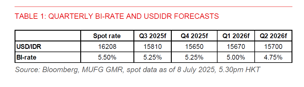 - For now, we maintain our USDIDR forecast at 15,650 by end-2025. This reflects ongoing cyclical downward pressure on the USD amid policy uncertainty and expectations for at least two fed rate cuts in H2. However, if the 32% tariff rate is set in stone by 1 August, we foresee potential 1-2% upside to our USDIDR baseline forecast, implying an exchange rate closer to the 16,000-level by end-2025. The tariff situation remains very fluid, with Indonesia’s chief negotiator heading to the US for further trade talks following the latest announcement.