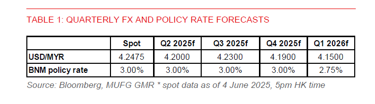 - The ringgit will likely be supported by a weak USD, US-China tariff de-escalation, and sustained investment flows. Ringgit bonds also remain in high demand, with a strong 3.3x bid/cover ratio for the 20-year GII bond auction on 30 May and rising foreign holdings of local government bonds (21.5% in April vs. Feb low of 20.6%). Foreign currency deposits also hit a record 11.6% of bank deposits in April, adding FX stability.