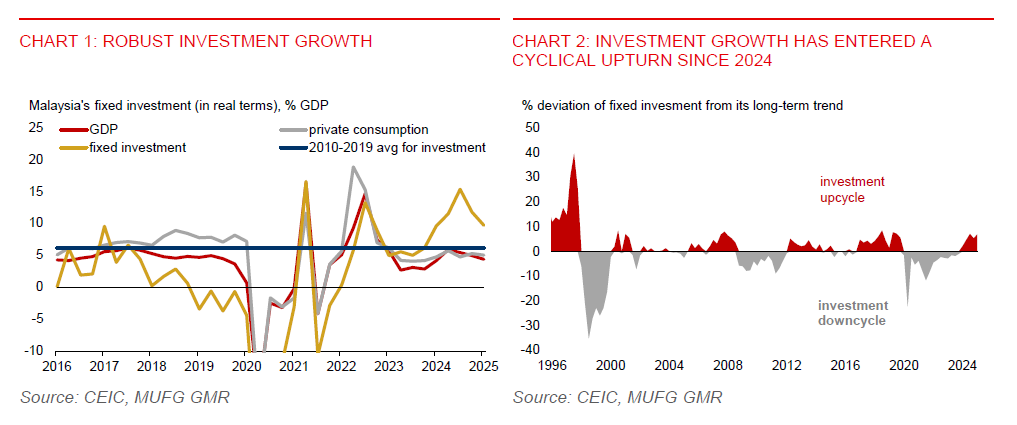 - Malaysia’s economic outlook remains clouded by global trade uncertainty, but a strong domestic investment upcycle has emerged as a key offset. Fixed investment growth (+9.7%yoy) outpaced private consumption (5%yoy) in Q1 2025. This is a trend that has begun in 2024, while investment levels have exceeded long-term trends since 2023.