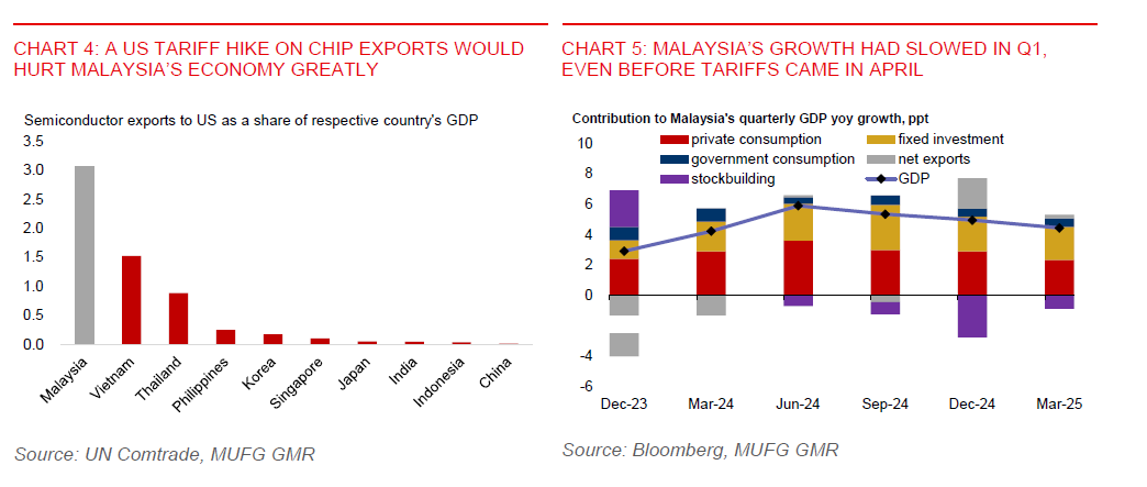 - US has imposed 10% baseline tariffs on imports from Malaysia for now, while a pause to the full 24% reciprocal tariffs for 90 days until 9 July has provided near-term reprieve. If full reciprocal tariff is applied after the 90-day hiatus, we estimate the new US applied tariff rates could rise to as much as 18%, potentially shaving an additional 0.4ppt from GDP growth. This takes account of existing product exemptions, notably semiconductor exports to the US, which made up about 3% of Malaysia’s GDP (Chart 3). This was the highest across the Asia region. A tariff hike on chip exports to the US would therefore likely pose a significant downside risk to our outlook for growth and the ringgit.