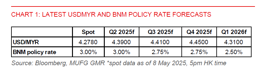 - Markets have unwound some of their excessive optimism towards the Malaysian ringgit (MYR). And there could still be further retracement ahead due to macro headwinds (Chart 1). Indeed, MYR is still more than 4% stronger than the US dollar on a year-to-date basis, despite tariff headwinds, while also outperforming the Bloomberg Asia dollar index (+3%). And while recent market optimism has been fuelled by potential US-China trade talks, it appears to be excessive. The road ahead for US-China bilateral talks, if any, will likely be a bumpy one and it would take time. US Treasury Secretary Scott Bessent has said earlier that a trade deal with China could take 2-3 years.