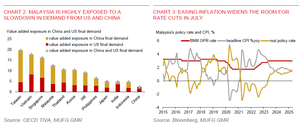 - There is no pre-emptive policy rate cut by Bank Negara Malaysia (BNM) today, but more external weakness ahead could still lead to a lower OPR. BNM has left the overnight policy rate (OPR) at 3.00% for a prolonged time (Chart 2), despite a wave of monetary easing seen across the Asia region. We still look for a 25bps rate cut this year, possibly as early as at the July policy meeting. BNM rhetoric appears to have also become more dovish, deviating from past neutral tone. BNM said trade tensions will weigh on the external sector and a deeper slowdown in trading partners poses risk to growth.