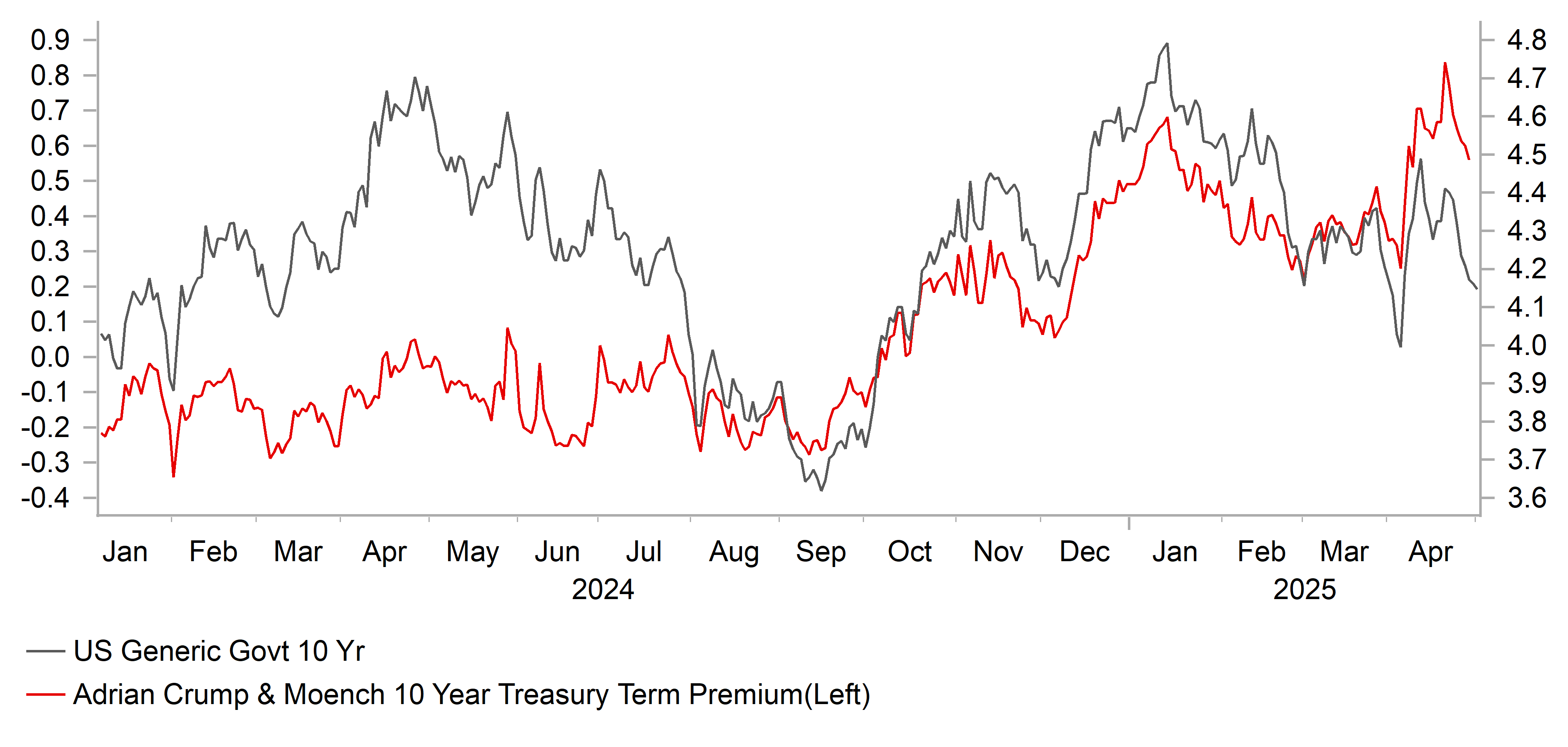 The 10-year bund yield fell notably in April, by 30bps to close at 2.44%. The drop in April means that the surge higher in the 10-year yield on 5th March in response to the German fiscal stimulus announcement has fully reversed. The donward pressure on yields in April came primarily from concerns over growth due to the reciprocal tariff announcement by President Trump on 2nd April which included rates way higher than investors expected. A 20% rate for Europe was suspended until early July in order for negotiations to take place. Given the large US trade deficit with the euro-zone it seems more likely than not that the 20% rate will go live in July and hence some degree of retaliation against the US is likely. Most ECB officials seem to view the tariff uncertainty as disinflationary and with growth set to remain weak and with China and Asia goods potentially set to boost supply into the euro-zone, we see the ECB delivering further easing. We have added an additional 50bps of easing for this year. The risk to this view is that retaliation from the EU is more aggressive than expected, leading to greater ECB caution. Still, based on our view and modest declines in UST yields, we expect only a modest rise in bund yields.