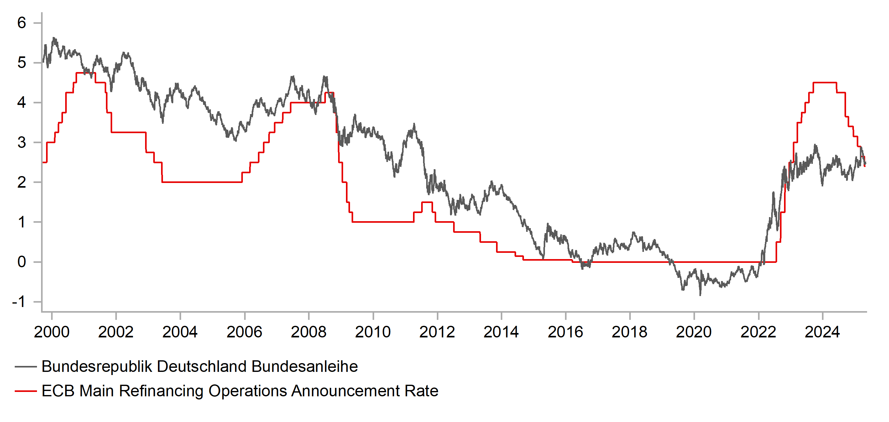 ECB POLICY RATE, % VS. GERMAN 10YR