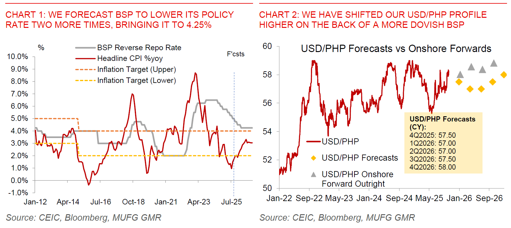 - From an FX perspective, we correspondingly shift our USD/PHP forecast higher, and see the FX pair moving to 57.00 by 2Q2026 from 56.50 previously, reflecting the additional BSP rate cuts.