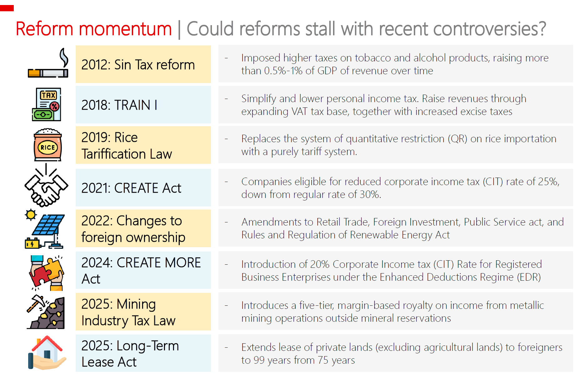 As a base case, we think that structural reforms should still continue, but perhaps the pace could slow down somewhat. A key risk to the Philippines Peso could come if the structural reform momentum stalls significantly but we stress this is not our base case.