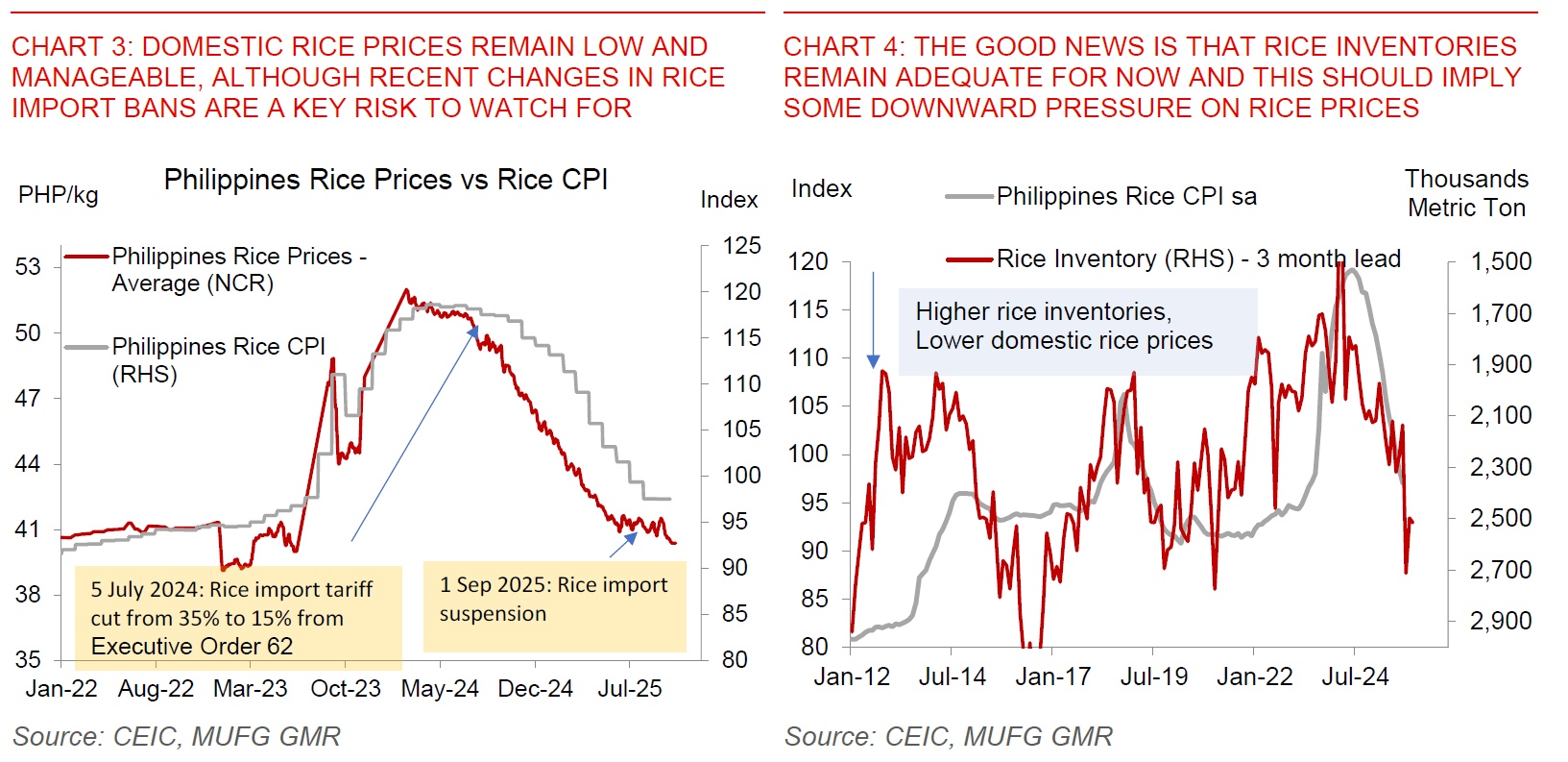 What has changed over the past month are two key domestic risks for the Philippines – 1) increasing concerns around corruption cases on flood control projects, and how this could spill over to the Philippines’ macroeconomy and markets, and 2) uncertainty around how the Philippines will handle rice imports and tariffs in 2026.