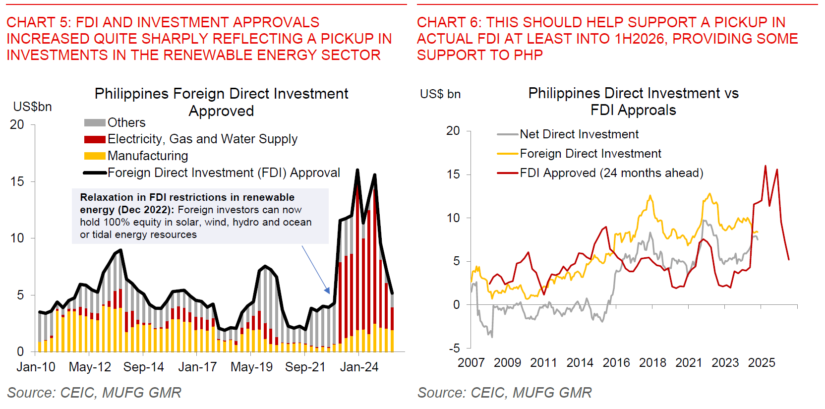 - We still think USD/PHP should move lower directionally at least in 1H2026, due to other offsetting positive factors such as a likely rise in FDI reflecting the surge in FDI approvals, manageable inflation, the lagged impact of policy rate cuts, and also inflows from an expected inclusion in the JPM GBI-EM bond index.