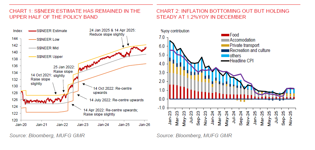 MAS left its current monetary policy setting unchanged at its January policy review, maintaining the prevailing rate of appreciation of the S$NEER band with no adjustments to its width or the level at which it was centred. Since the October 2025 policy review, the S$NEER has continued to trade in the upper half of the policy band, reflecting resilient domestic fundamentals. MAS’ latest policy decision signals confidence that the current policy setting remains appropriate to secure medium‑term price stability, especially as the economy enters 2026 on firmer footing.