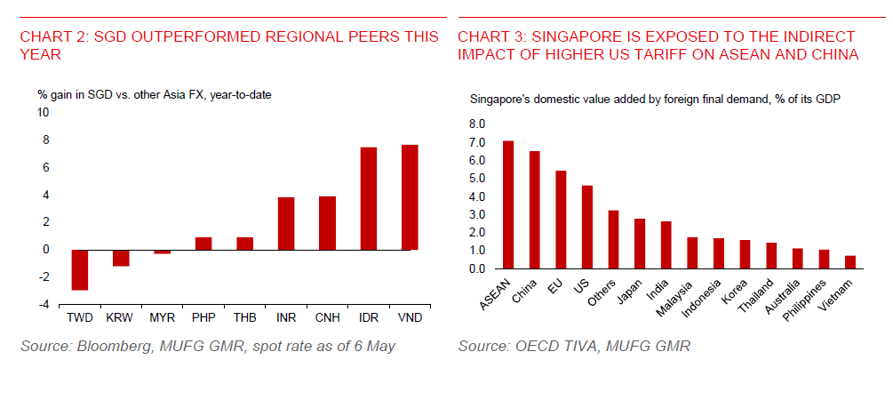 - The Singapore dollar (SGD) has gained significantly against the US dollar this year, but we are cautious about extrapolating recent bout of SGD strength due to macro headwinds. The Singapore dollar has risen against the US dollar by more than 5% on a year-to-date basis, outperforming the Bloomberg Asia Dollar Spot Index (+3%) and most emerging Asian currencies. Potential trade talk between the US and China has likely fuelled this optimism. China’s Ministry of Commerce said on 2 May that it is evaluating a potential trade talk with the US.