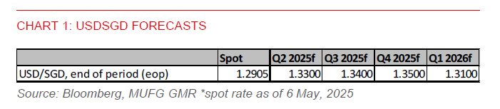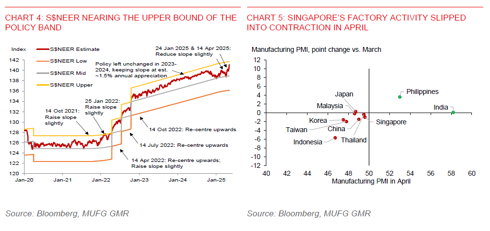 - With our estimate of Singapore’s S$NEER approaching the upper bound of the policy band, there is likely limited room for further sharp SGD appreciation in our view. Our S$NEER estimate has gained by about 1.7% since the MAS policy meeting on 23 January, despite the central bank loosening its exchange rate policy setting in both the January and April policy meetings. This implies the S$NEER is possibly trading at around 0.4%-0.5% below the upper bound of the policy band, which is not seen since 24 September 2024, when USDSGD was at a decade low of 1.2835. USDSGD subsequently rebounded sharply in Q4 2024.