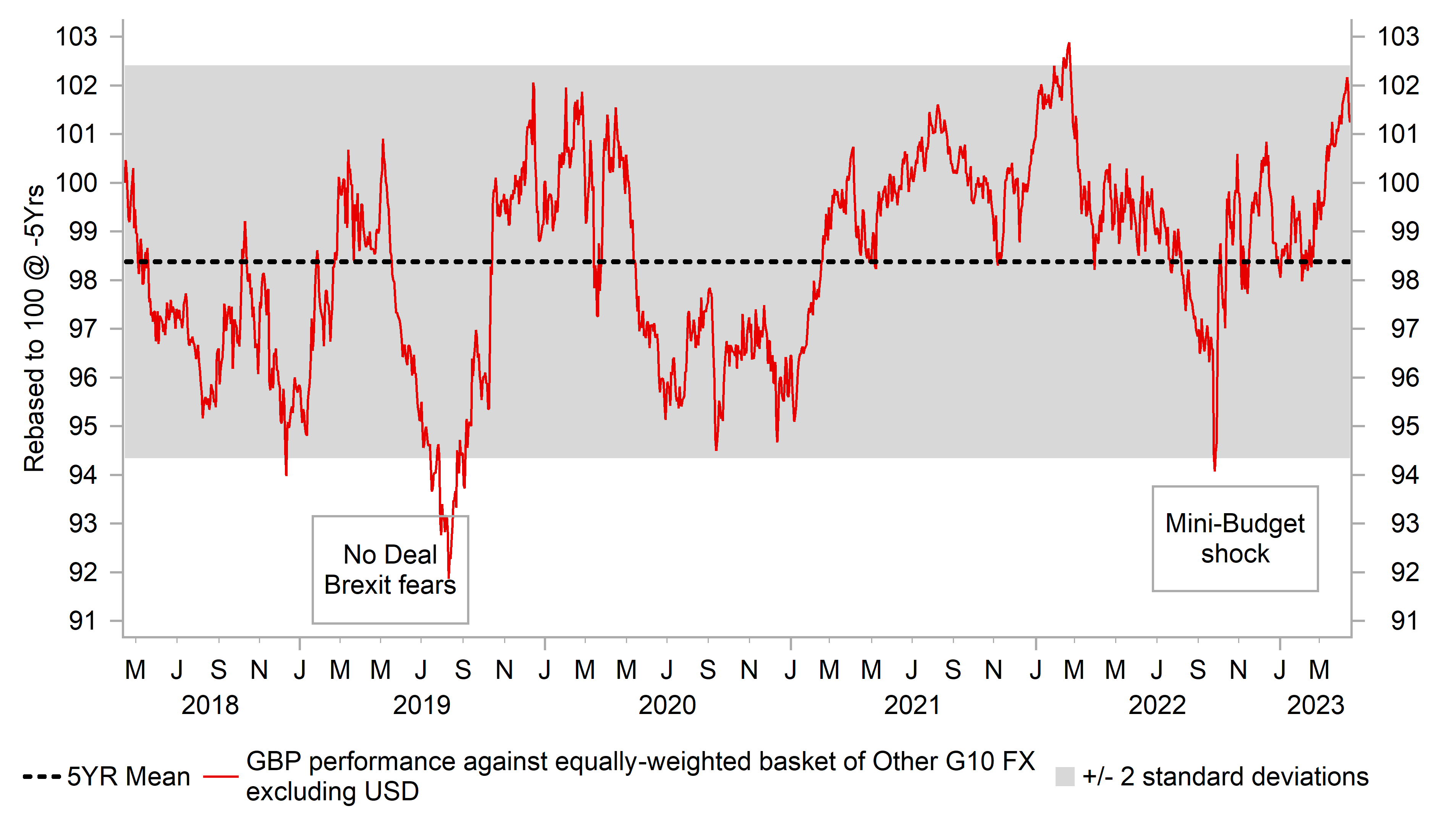 We mentioned at the start of the year that we felt we had reached “peak pessimism” in relation to GBP sentiment and that is how we would explain the performance of the pound on a year-to-date basis. The pound is the second best performing G10 currency this year after just being surpassed by the Swiss franc. It is only marginally outperforming the euro though but is performing a lot better than the rest of G10. The gains feel to be a little more by default rather than for outright specific factors. The pound was the 3rd worst performing G10 currency in 2022 (-10.7% vs USD) and the mere fact that the political backdrop has improved from the turmoil in H2 last year is enough in itself to see some of the 2022 weakness reverse. But there are other factors that should help provide the pound with better support over the coming months although with the ECB set to hike for longer, gains will be more difficult versus EUR.