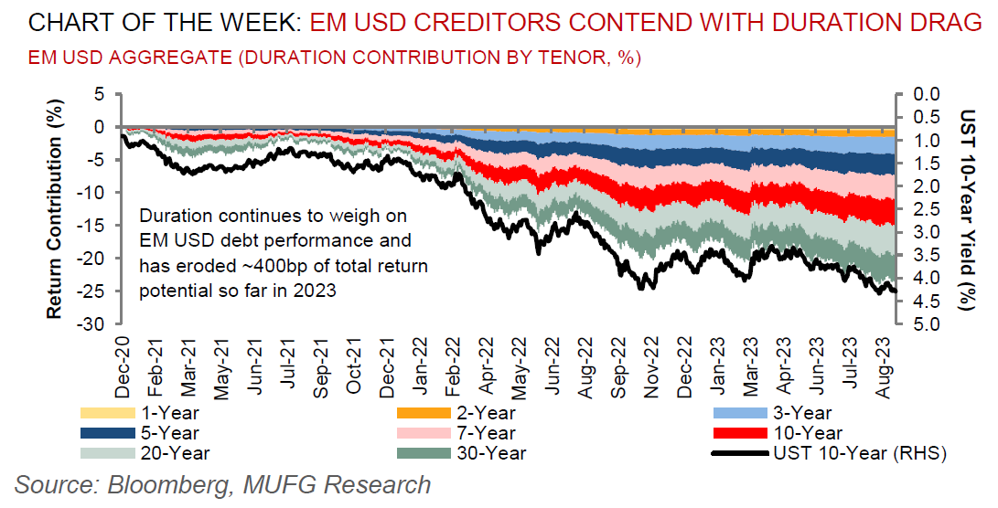 The ”higher for longer” narrative is evoking parallels to the 1990s, when tepid growth, rising debt defaults and a slew of FX devaluations loaded EM creditors with large losses. Carry has managed to insulate EM credit from higher US Treasury yields, yet the outlook remains firmly associated with US financial conditions. With US rates trading as if they are still in a bear market, we are cautious on the near-term EM outlook until we see signs of US weakness that allows the Fed to dial down its hawkish rhetoric.