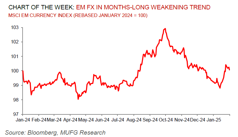 The benign global macro outlook – with solid growth, normalising inflation and the tailwind of gradually declining rates in the US and beyond – now looks to be disrupted by one of the well-flagged risks coming into 2025. Over the weekend, President Trump signed executive orders imposing a 25% tariff on imports from Mexico, a 25% tariff on imports from Canada apart from energy, which would face a 10% tariff, and a 10% tariff on imports from China. These tariffs would apply above and beyond existing tariffs – effective 4 February. From an EM perspective, we expect the EMBI Global Diversified (EMBIGD) index could knee-jerk wider by up to ~20bp early this week and we could see Mexico 5 year CDS spreads jump higher by ~30bp. The overall EM spread move would likely depend on the degree to which a threat of a prolonged trade war spurs a broader risk off move, a corresponding rally in US Treasuries and some market pricing that the sentiment channel could derail US exceptionalism and growth.