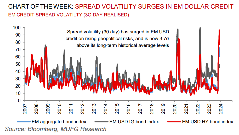 The Central Bank of Egypt (CBE) and Czech National Bank (CNB) held interest rates at 19.25% and 7.00%, respectively. Turkey’s October inflation came in at 61.4% y/y, lower than both our and market expectations. Q3 2023 GDP growth for Czech Republic came in at -0.6% y/y, leaving the country on the edge of another recession.