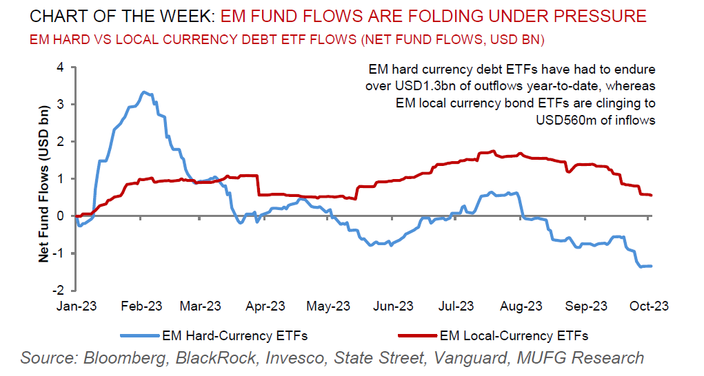EM FX continues to underperform even as USD weakens modestly against other major currencies. Rising US yields are proving more disruptive for financial market. Popular FX carry trades are reversing. Main impact so far from Hamas-Israel conflict has been higher price of oil, posing downside risk for EM FX.