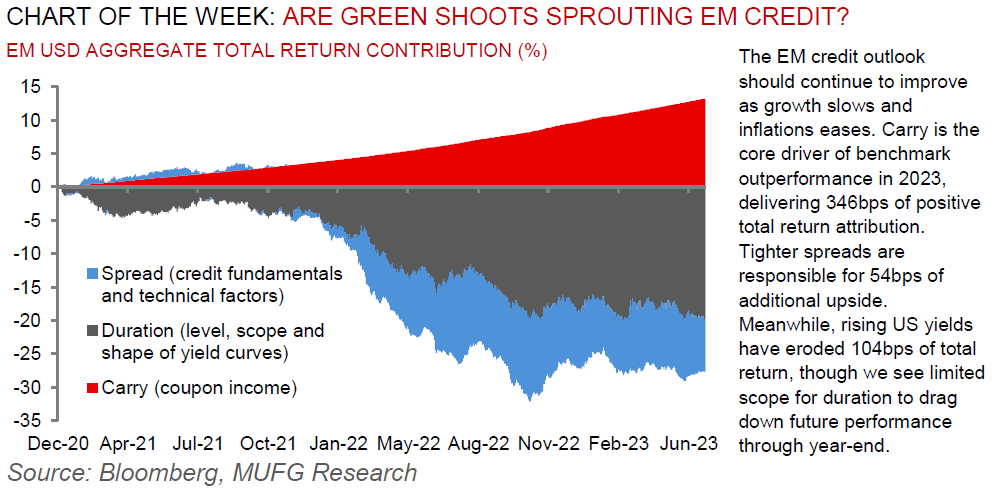 This week, we will have the rate decision in Israel (MUFG and consensus on hold at 4.75%) and June CPI data will be released in Russia, the Czech Republic, Romania, Poland and Israel (all set to decline bar Russia). Finally, May and Q2 2023 BoP data will be published in Turkey and Russia, respectively (both set to weaken).