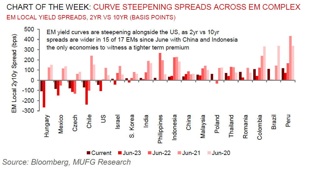 It seems to us most of the reading out there on EM is on the bearish side. Cyclical data in the US has been better than expected while geopolitical risk has increased significantly. Yet in the face of this price action is holding up much better than the narratives suggest. Most risk assets are not too far from levels than they were before the good NFP while certain EM FX pairs like ZAR and MXN have surprisingly strengthen. Thus we would focus on this rather than hypothesising  on the huge unknowns that could eventuate from the Israel conflict.