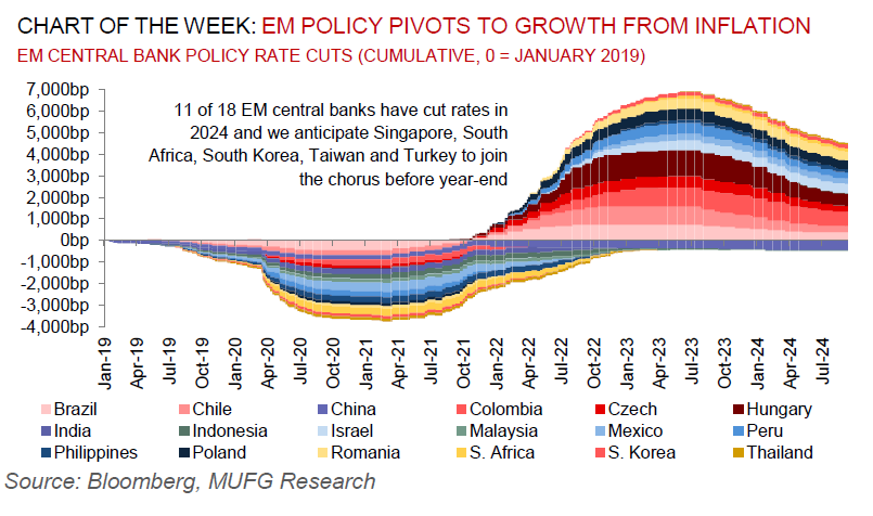 Growth across the EM universe is set to stabilise as domestic fundamentals offset external drags, with some rotation from the largest to smaller EMs. Inflation and interest rates are both “over the hump” – disinflation is progressing, and the decline in rates will continue and broaden for the remainder of 2024.