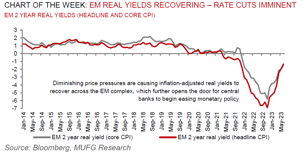 This week, we will have rates meetings in South Africa (MUFG and consensus +25bp to 8.50%), Turkey (MUFG +400bp to 19.00%; consensus 18.00%) and Russia (MUFG and consensus +50bp to 8.00%). Additionally, June’s inflation data will be released in South Africa (MUFG: 5.6% y/y; consensus 5.5% y/y).