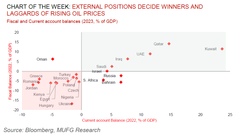 Oil prices have become an important differentiator of EM performance as they stand close to 30% higher since the end of June. There are ample moving parts to know where oil prices will go from here, but as we have recently catalogued, whilst tight fundamentals suggest that the gravitational tilt for prices are to the upside, we maintain our year-end 2023 and 2024 Brent crude target of USD84/b and USD87/b, respectively, with a surge back north of USD100/b – albeit within striking distance – not our base case scenario (see here and here). From an EM perspective, the winners are recognisable – major net oil exporters (GCC region, Colombia, Malaysia Nigeria and Russia) – with higher energy prices boosting the terms of trade, improve balance of payments positions and give a lift to lift to floating exchange rates where they are present. On the flipside, many major EMs are net importers of fuel (CEE region and most of EM Asia) stand to lose from higher oil prices, through a deterioration in external account positions, driving-up production costs for manufacturers and dampening demand by squeezing real incomes through higher inflation.