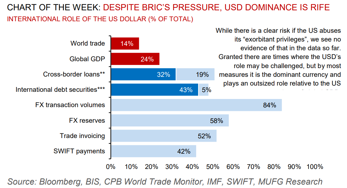 The BRICS grouping of major emerging markets – Brazil, Russia, India, China and South Africa – is holding its fifteenth summit between 22-24 August. The top of the summit’s agenda will be anchored on (i) an expansion of the blocs members (23 countries are interested in joining according to South African officials); (ii) greater use of local currencies to settle trade between each other; and (iii) prospects of a BRICS currency which may have the potential to challenge the dominance of the US dollar. Whilst any “BRICS+” grouping could bring into question the speed and scale with which member countries adopt commercial and financial systems outside of the US dollars domain, we hold conviction in our previous examination that being fed up with the US dollars dominance is old hat, and it will remain the world’s currency of first resort, in our view (see here).