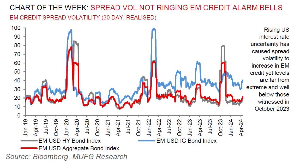 EM currencies have become more volatile in recent weeks triggered both by the hawkish repricing of Fed rate cut expectations and heightened geopolitical risks in the Middle East. The pick-up in foreign exchange and bond market volatility this month has triggered at least a temporary squeeze of popular FX carry trade positions. Bloomberg’s EM FX carry trade index which measures the cumulative total return of a buy-and-hold carry trade position that is long eight emerging market currencies (BRL, MXN, INR, IDR, ZAR, TRY, HUF & PLN) funded with short positions in the USD.