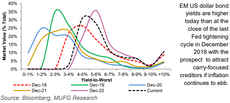 With the Fed now in the home stretch alongside US growth that remains low (but non-recessionary), interest in the EM carry is front and centre of attention. We recently catalogued that relatively high EM front end rates both in nominal and real terms compared to DMs argue for EM carry trades in high yielders in a foggy macro environment (see here). Given this backdrop, and our expectation for a shallow and bumpy US dollar outlook, demand for carry has emerged as the driving factor for EM investment in 2023, with the prospect to better protect creditors from adverse movements in domestic currencies, credit spreads and bond yields. The EM local currency liquid government bond index has already generated 166bps of coupon income in 2023, as contribution to return from carry is running ~2x as fast as the 10 year average. On net, higher coupon income reduces the downside risk, improves the total return asymmetry and enables creditors to better withstand unfavourable developments in both spread and duration.