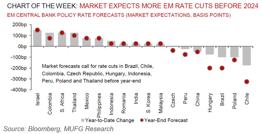 This week will see South Africa publish its mid-term budget plan on 1 November. Rate meetings will be held in Egypt (MUFG: 100bp to 20.25%; consensus: on hold) and the Czech Republic (MUFG and consensus: on hold at 7.00%). Inflation data for October will be released in Poland and Turkey. GDP for Q3 2023 will be released in the Czech Republic. Finally, PMIs from various EM EMEA economies will be released throughout the week.