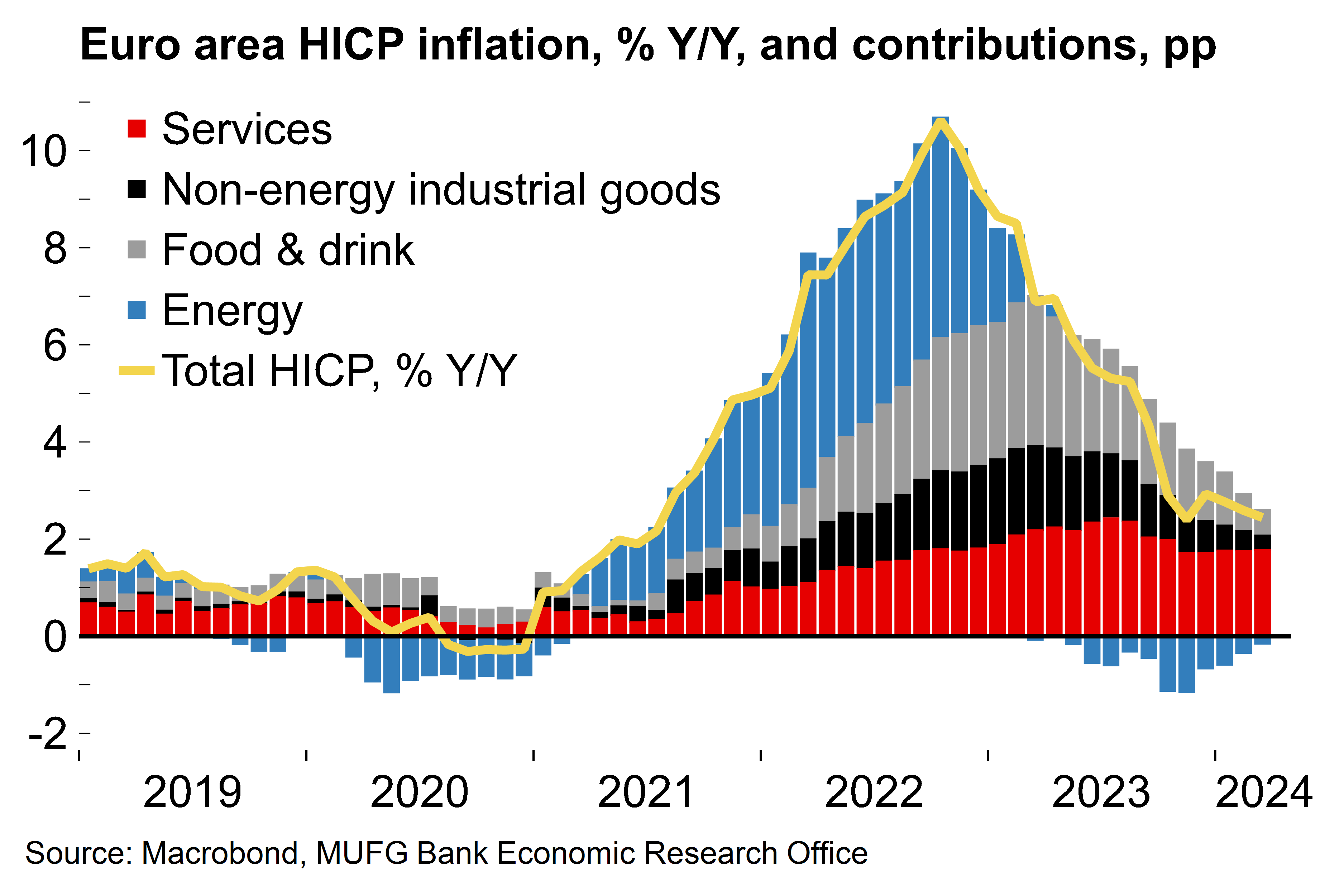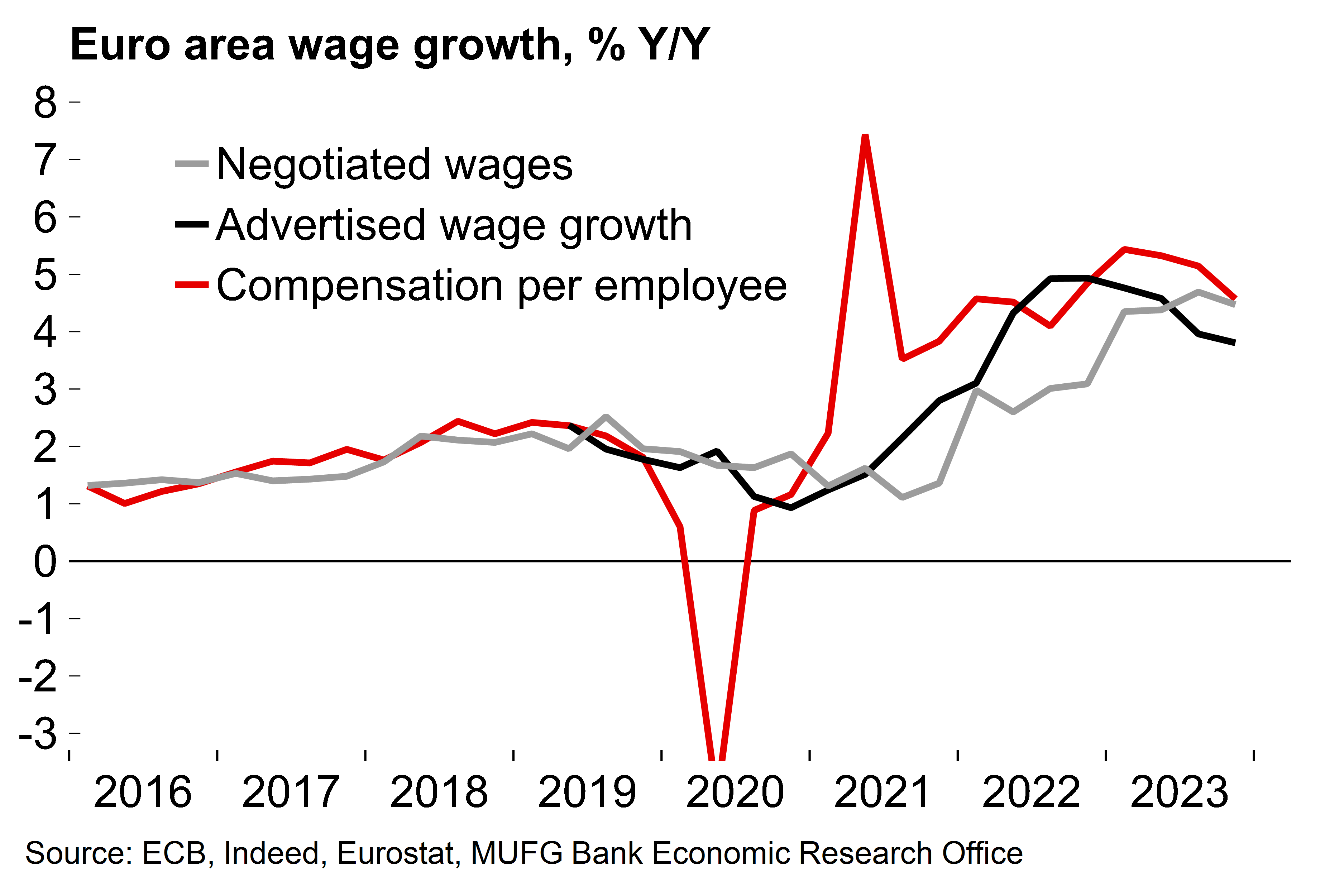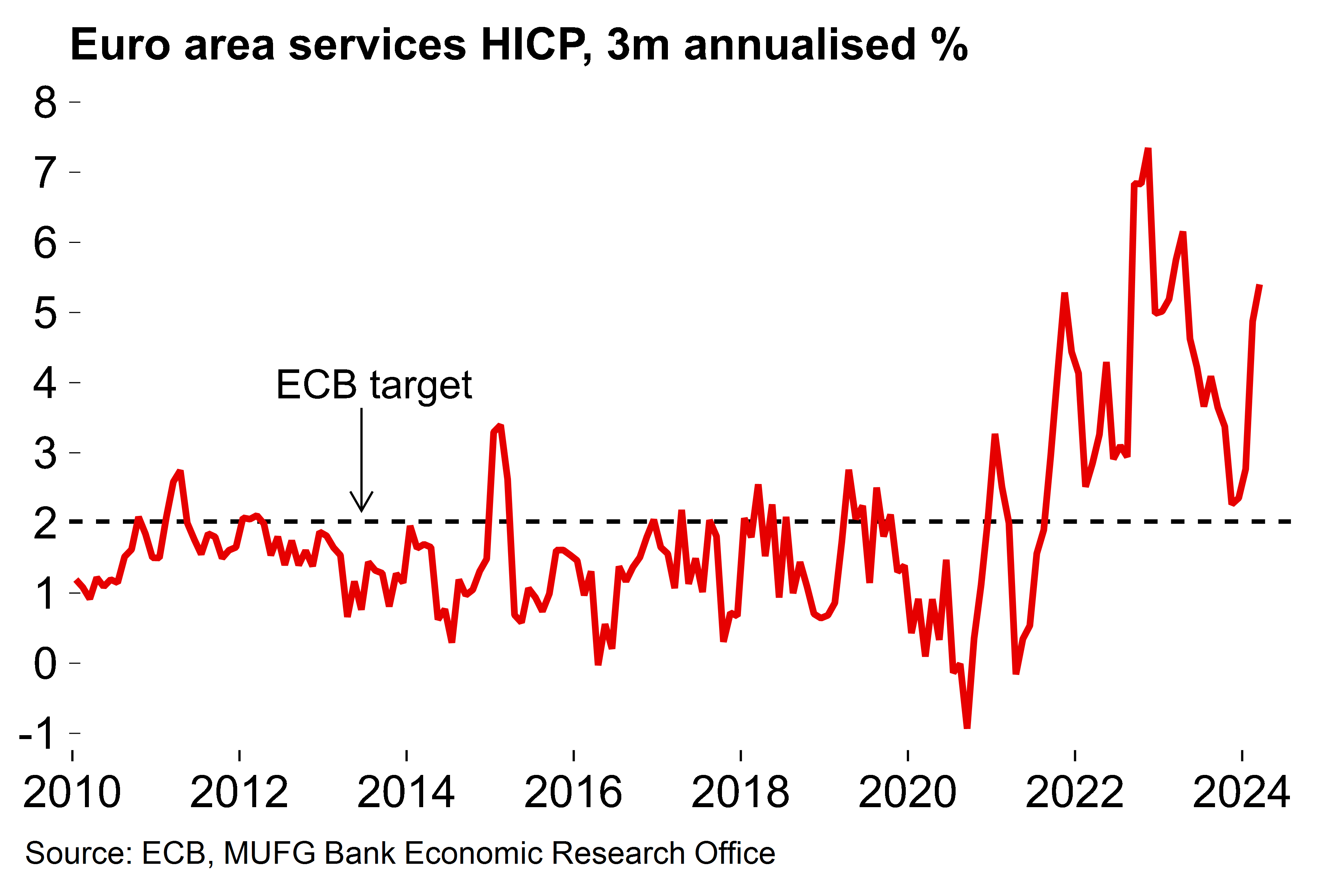 There are still valid reasons for caution, not least the persistence of services inflation (see below) and still-elevated wage growth (Chart 2). The minutes of the March meeting noted the importance of being “further along in the disinflation process” and accumulating “additional evidence for the Governing Council to be sufficiently confident that inflation was set to return to target in a timely and sustainable manner”. Despite lags in the figures there’s no obvious reason to depart from the data-dependent footing just yet.