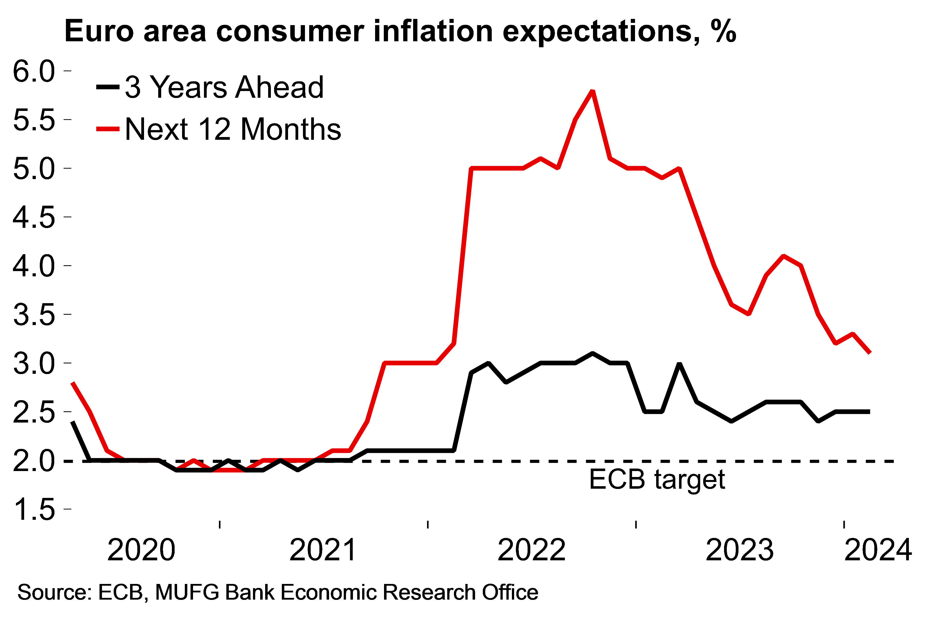 Next week’s policy meeting, just five weeks after the previous one, is therefore likely to be relatively low-key, with the current holding pattern set to be maintained for what looks like the final time. There have been no significant data shocks since the last outing – as we note below, headline euro area inflation, at 2.6% in Q1, has evolved as the ECB set out in its latest projections. Elsewhere, the further decline in consumer inflation expectations (Chart 1) was encouraging, but it is not a major surprise given the series’ recent trajectory. There have been no efforts from policymakers to suggest that this is a live policy meeting (only 2 bp of cuts are priced by market participants). Instead, we’re likely to see a bit more groundwork for a June cut. We expect that officials will underscore the intention to start cutting rates then with shifts in the statement language and perhaps some more explicit comments from Lagarde in the press conference.