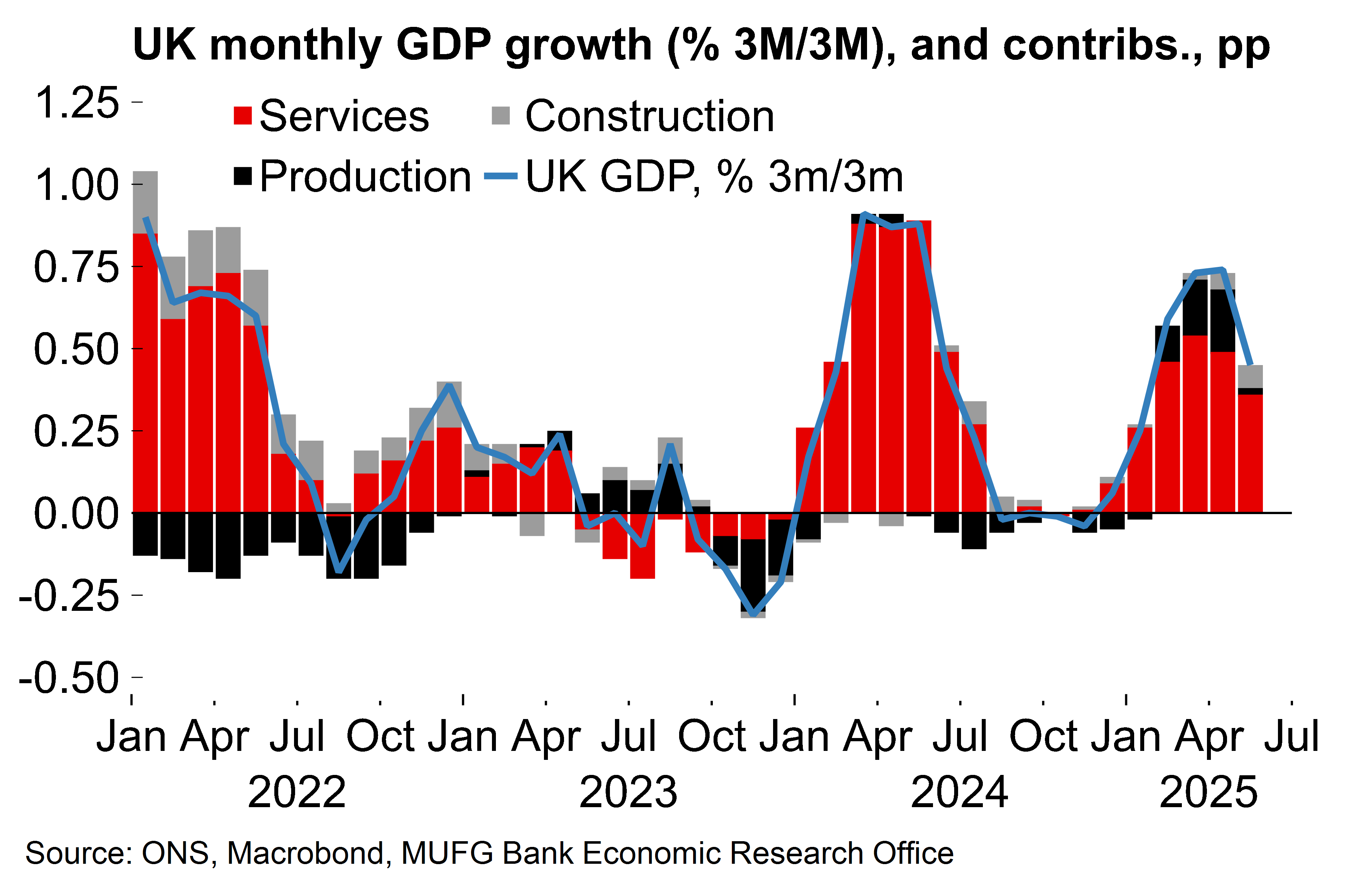 Look past the noise and the underlying story on growth isn’t that bad. On a 3M/3M basis, GDP expanded by 0.5% after a sizeable upward revision (+0.2pp) to the March growth figure. The May figures were also more mixed than the headline number alone suggests. Yes, production was weak as frontloading effects reversed, and there was a sizeable drag from the volatile retail sector. But overall services still held up fairly well (0.1% M/M). Within that, there was strong growth in information and communication (3.2% M/M) which could be an indicator of AI-related investment.