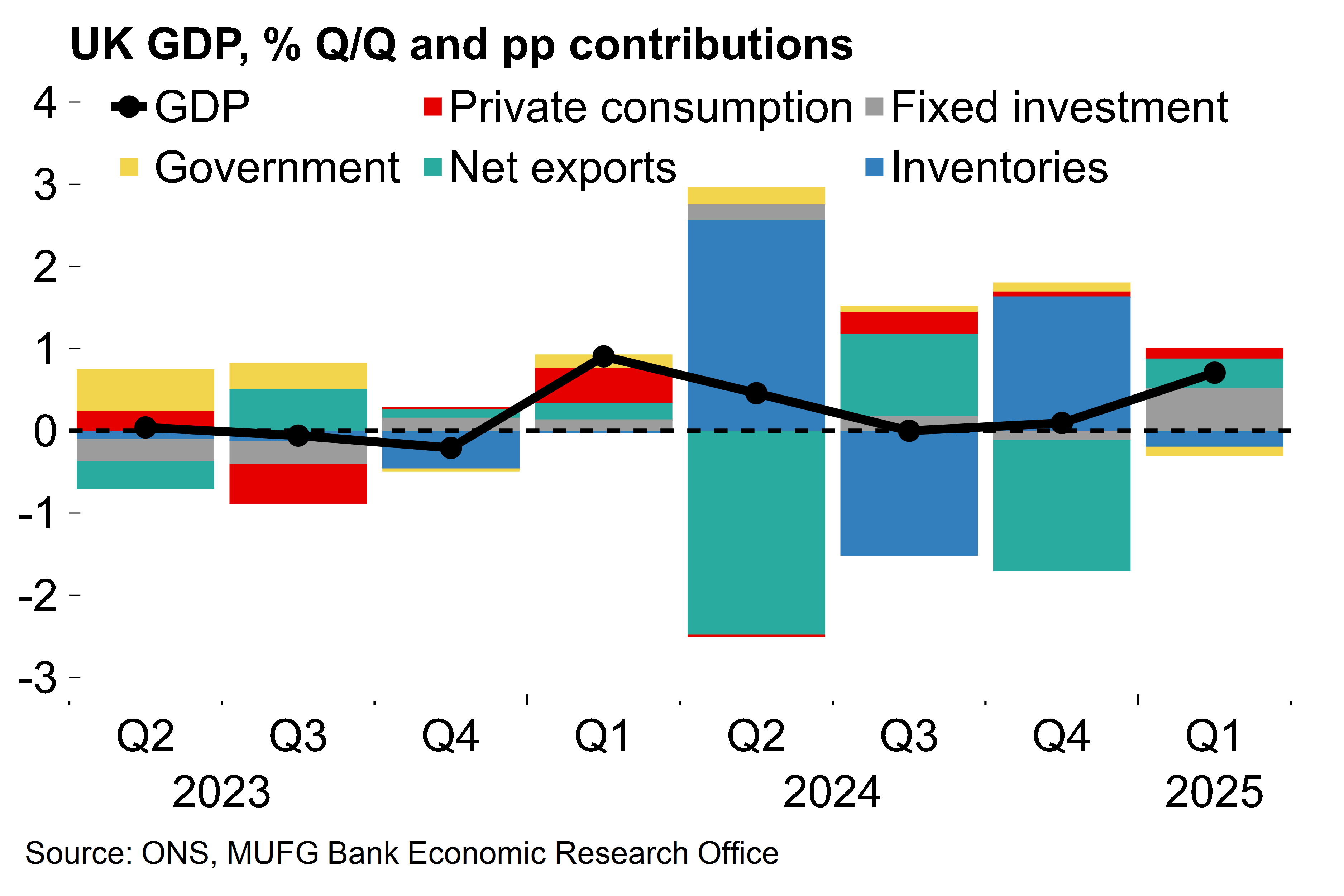 The UK economy made another flying start to the year with growth of 0.7% Q/Q, the fastest rate since Q1 2024. There was plenty of good news. In terms of expenditure contributions, fixed investment (+0.52pp) and net trade (0.36pp) were the key drivers, with some additional support from household expenditure (+0.12pp).