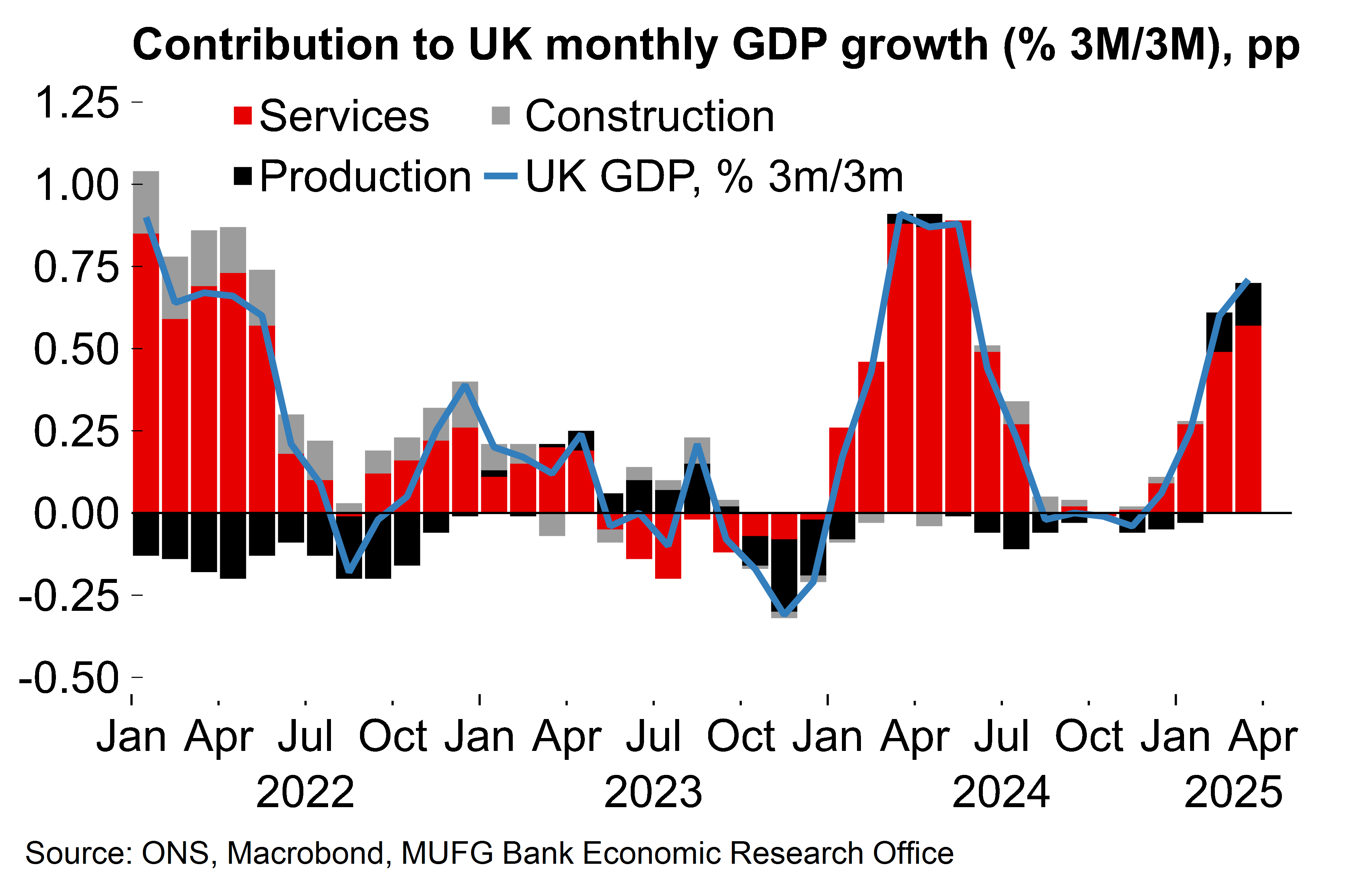 We remain relatively optimistic about the UK outlook but nevertheless expect that strong Q1 growth will be a short-lived spurt. The temporary boost from US frontloading will reverse in Q2. US tariffs plus related uncertainty around global growth prospects will clearly provide an additional headwind, with signs of that already seen in the weak April PMIs.