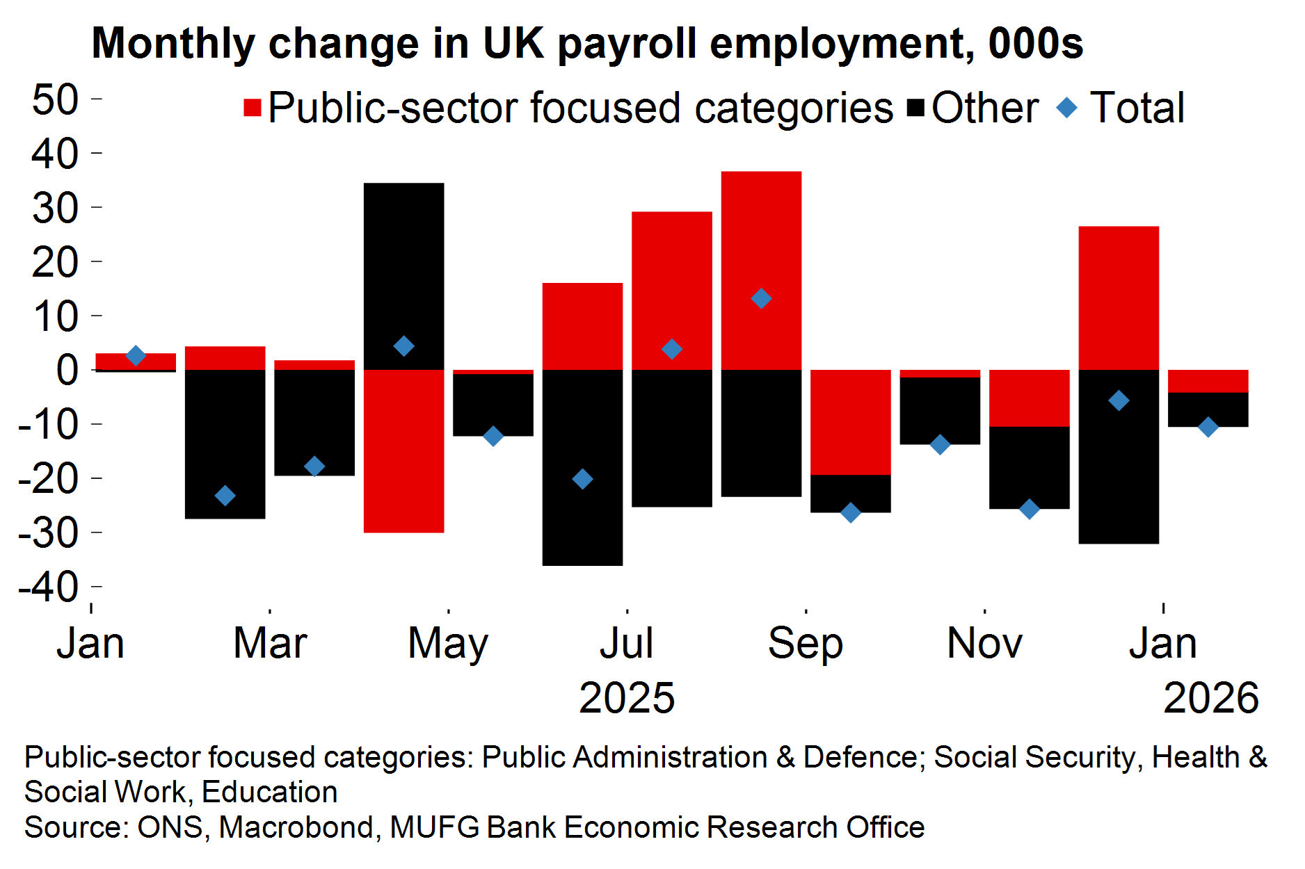 The caveat here is that the cycle of Budget speculation and subsequent relief (and possibly some residual seasonality) has resulted in a bumpy UK growth profile. While we think that the strong January PMI was flattered by Budget relief and will moderate lower in February (the flash figures will be released on Friday), we still expect GDP growth will improve to 0.4% Q/Q in Q1. Looking ahead, disinflation and further BoE easing are likely to provide some support to activity in 2026, but growth is likely to remain relatively subdued, as we set out here. On an annual average basis we now see GDP growth falling to 1.0%.