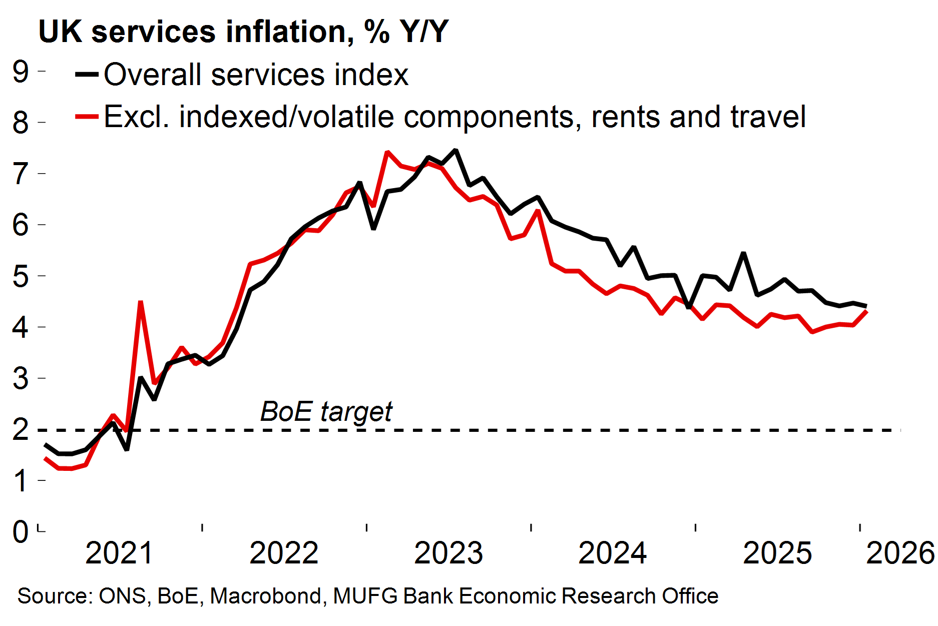 However, underlying disinflation was less pronounced in this release than expected. The core and services measures only decreased by 10bp each, to 3.1% and 4.4% respectively (both 30bp above the BoE projections). The BoE will certainly be unsettled by signs of sticky underlying services. We calculate that the BoE’s gauge of underlying services inflation (which excludes indexed/volatile components, rents and travel) increased from 4.0 to 4.3%, which policymakers will find uncomfortable.