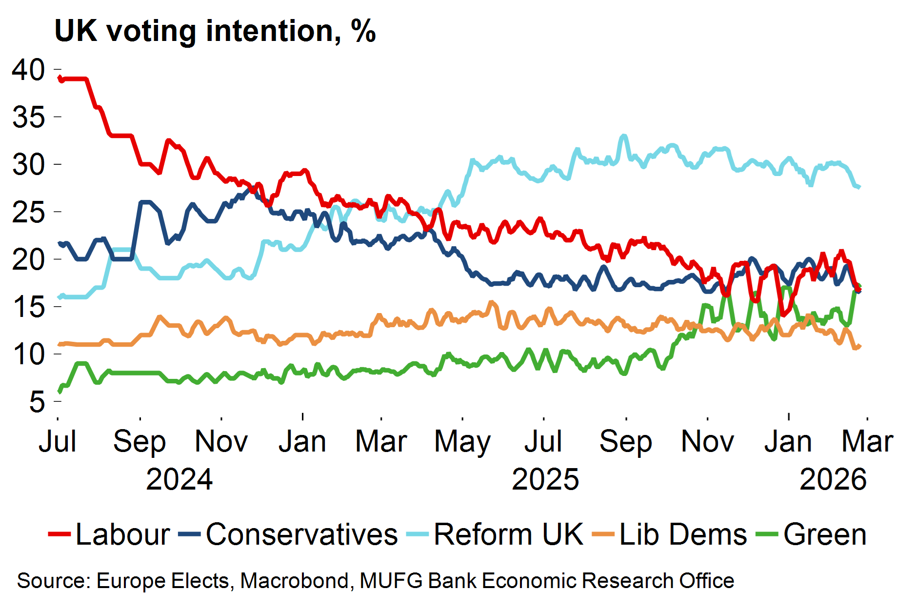 It’s easy to overinterpret by-election results – government parties generally do badly – but the result does reinforce the sense that Labour is struggling as the UK political landscape fragments. The most recent national poll from YouGov shows the five largest parties polling within a 10pp range. Within that, Labour’s support has dipped below 20% and pressure continues to mount on Starmer personally. His approval ratings are dire and prediction market prices imply a ~70% chance that he will be ousted as PM at some point this year.