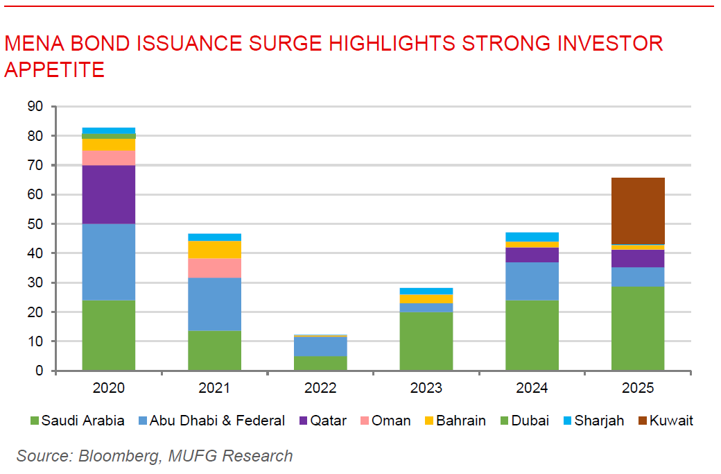 MENA bond issuance surge highlights strong investor appetite. Bond sales in the Middle East and North Africa surged on 30 September as governments rushed to tap global markets ahead of expected us rate cuts, with Kuwait raising USD11.25bn in its first international issuance in eight years and Egypt securing USD1.5bn through sukuk to diversify funding amid its economic recovery. Demand was strong, with Kuwait’s three-, five-, and ten-year notes attracting over USD27bn in bids and pricing at no more than 50bps above Treasuries. While Egypt’s sukuk drew USD8.9bn in offers, yielding 6.375% and 7.95% for the three- and seven-year tranches. Bahrain also mandated banks for a two-tranche dollar issuance, and Algeria announced plans to raise USD2.3bn locally through Islamic bonds, a rare move for the OPEC member. Meanwhile, Saudi Arabia has already raised nearly USD20bn in global debt this year, making it one of the world’s largest emerging market issuers alongside Mexico. The wave of issuance reflects governments’ efforts to plug widening fiscal deficits caused by lower oil and gas prices, while investors continue to be drawn to high yields and narrowing risk spreads across emerging markets.