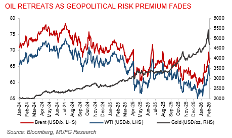 Oil retreats as geopolitical risk premium fades. Oil prices fell sharply after posting their strongest monthly gain since 2022, as geopolitical risk premiums eased following comments from President Trump indicating renewed talks with Iran. Brent slipped toward USD67/b after rising 16% in January, while WTI held above USD63/b, with Trump playing down threats of regional conflict and expressing optimism about a potential deal. The pullback comes after weeks of gains driven by fears of supply disruptions in the Middle East, which had briefly overshadowed concerns about a looming global surplus. Adding to the bearish tone, OPEC+ confirmed plans to keep production steady in March, while broader market sentiment was weighed down by a sharp correction in precious metals, reinforcing a shift away from risk-driven momentum trades.