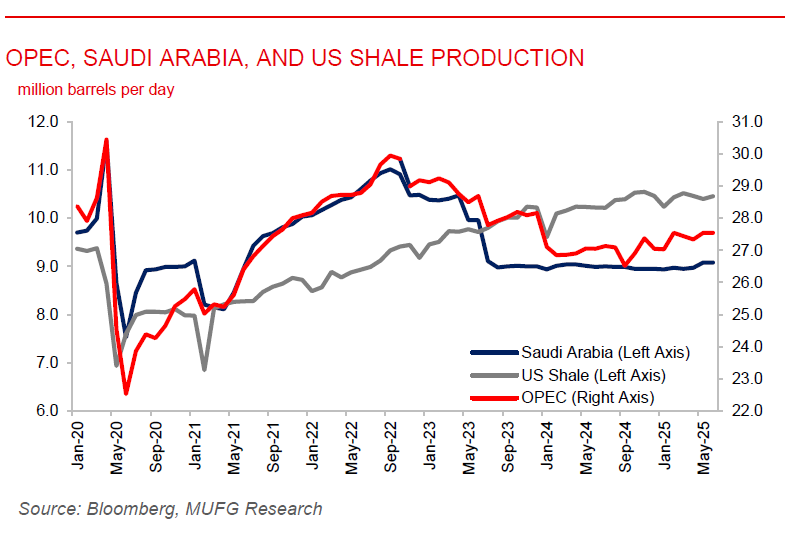 Saudi Arabia leads surge in Middle East oil export. Saudi Arabia, along with Kuwait and the UAE, ramped up crude exports to 11.9mb/d in June, the highest level since April 2023, as the trio appeared to accelerate shipments amid regional tensions and ahead of an expected OPEC+ supply boost. Saudi exports alone jumped by 441,000b/d to 6.36 million, despite rising domestic use due to extreme summer heat. The export surge likely reflects a strategic push to move barrels while shipping route remained stable under a fragile Israel-Iran ceasefire. With OPEC+ already approving three consecutive 411,000b/d month hikes, the group will meet this weekend to consider a fourth for August. The shift from years of supply restraint to aggressive increase marks a bold pivot by Saudi Arabia, possibly aimed at regaining market share lost to rivals like US shale.