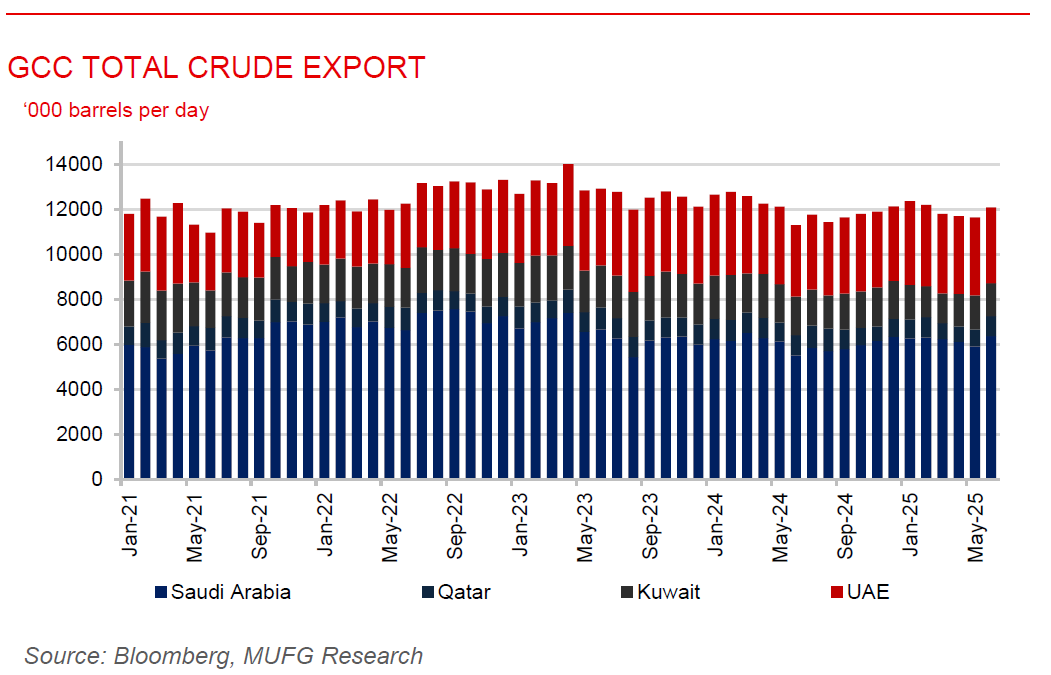 Gulf crude exports surge in June despite geopolitical risks. Crude and condensate exports from key Gulf producers – Saudi Arabia, the UAE, Qatar, and Iran, surged in June, reaching multi-month highs despite widespread GPS interference and maritime threats in the Strait of Hormuz. UAE shipments jumped to 3.74mb/d, the highest since November, with gains across most Gulf terminals and rising flows to Japan and India. Qatar’s exports rose to a 12-month high of 883k b/d, fuelled by increased deliveries to China. Saudi Arabia led the region, boosting exports to 6.36mb/d, the most since March 2024, as it ramps up output under OPEC+’s planned supply hikes. Iran’s preliminary exports hit 1.79mb/d, despite tracking challenges due to signal spoofing and tanker obfuscation. The rise in Gulf exports comes amid a shift in OPEC+ strategy, with members like Saudi Arabia and the UAE aggressively reclaiming market share ahead of another expected quota increase in August.