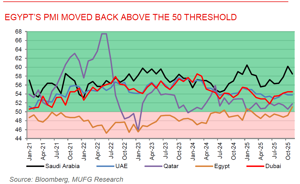 Egypt’s private sector recovery and improving external balances. Egypt’s economic momentum strengthened toward year-end as both domestic activity and external balances moved in a more favourable direction. PMI climbed to 51.1 from 49.2 in November, marking the strongest expansion in more than five years and returning the index above the 50 threshold for the first time since February, driven by broad-based growth in output and new orders across manufacturing, construction, and services, while cost pressures eased thanks to lower import prices and a firmer Egyptian pound. The rebound in demand suggests that earlier macro stabilisation measures are beginning to translate into real economy activity. In parallel, Egypt’s external position improved, with the current account deficit narrowing to around USD15.4bn in FY2024/25, down from about USD20.8bn in the previous fiscal year, reflecting stronger tourism revenues, increased services exports, and improved capital needs. Taken together, these trends point to a gradual economic normalisation, where recovering private-sector momentum and a more manageable external position reinforce near-term growth prospects, even as structural challenges remain.