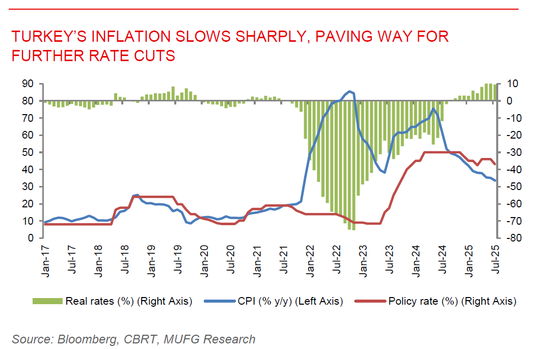 Turkey’s inflation slows sharply, paving way for further rate cuts. Turkish inflation slowed more than expected in July, easing to 33.5% y/y from 35.1% y/y, and bolstering the Central Bank of Turkey (CBRT)’s recent decision to resume interest rate cuts. The slowdown was driven largely by unexpectedly low clothing and food prices, despite a monthly inflation uptick to 2.1% due to tax hikes and energy price increases. The data has strengthened expectations for another significant rate cut in September, following July’s cut from 46.0% to 43.0%. while the CBRT targets year-end inflation of 24.0%, many anticipate a closer figure of 30.0%. challenges remain in sectors like housing and education, which saw steep price increases. Governor Fatih Karahan is expected to update the inflation outlook on 14 August, as the central bank continues navigating inflation dynamics and political pressures following previous market disruption.