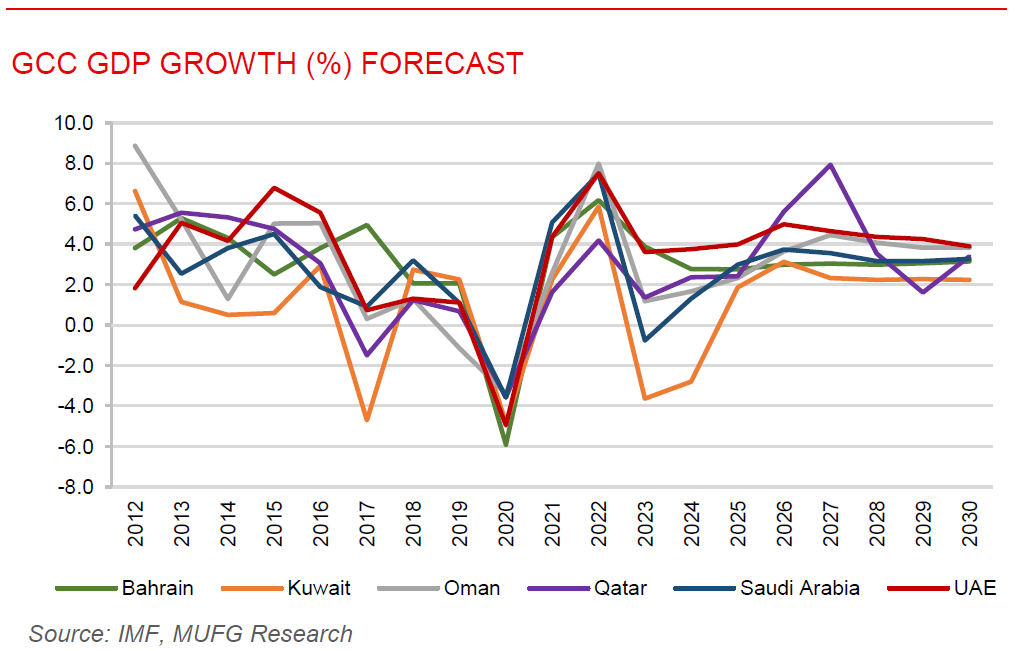 Bahrain’s GDP growth accelerates in Q3 2025 on broad-based expansion. Bahrain recorded a 4.0% y/y increase in real GDP in Q3 2025, marking a clear acceleration from earlier quarters and signalling strengthening economic momentum. Growth was broad-based, with the non-oil sector expanding by around 3.1%, supported by solid performance in financial and insurance activities, real estate, and transportation, underscoring ongoing diversification efforts. The oil sector also contributed positively, rising sharply on a y/y base, helping lift overall growth. The Q3 outcome points to a more balanced economic recovery, with both oil and non-oil activities supporting output, and provides a firmer macroeconomic backdrop heading into late 2025 and early 2026. Going forward, GDP growth is expected to moderate to around 2.8% in 2025, before strengthening toward roughly 3.2% in 2026.