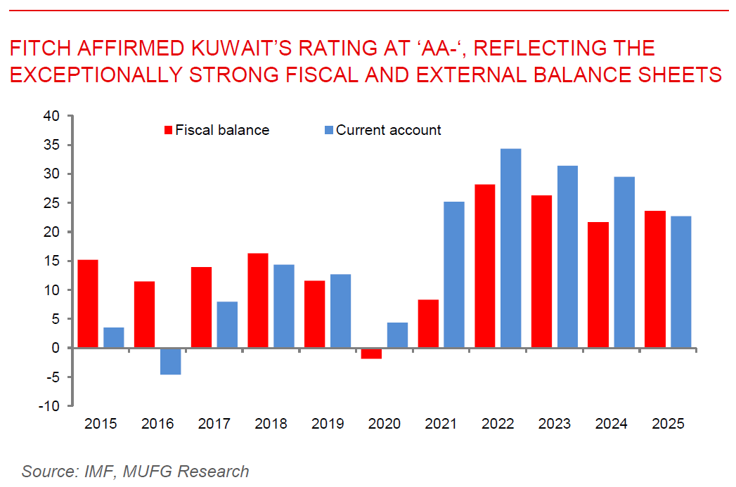 Fitch affirms Kuwait at ‘AA-‘ stable on strong assets. Fitch Ratings has affirmed Kuwait’s credit rating at ‘AA-‘, reflecting the country’s exceptionally strong fiscal and external balance sheets but also structural weaknesses tied to governance, oil dependence, and high welfare spending. Kuwait holds the strongest external balance sheet if any Fitch-rated sovereign, with sovereign net foreign assets forecast to rise to 607% of GDP in 2025, primarily via the Future Generations Fund. Recent reforms include a new financing and liquidity law, allowing debt issuance for the first time since 2017, with plans to raise KWD30bn over 50 years to ease reliance on the General Reserve Fund and support capital markets. While non-oil revenue remains weak at just 8% of non-oil GDP, Kuwait has introduced a 15% minimum tax on multinationals starting 2025 and plans to adopt GCC-wide excise taxes by 2027, though broader measures like VAT are unlikely soon. While vast sovereign assets provide a strong buffer, Kuwait’s heavy oil reliance leaves it vulnerable to price swings, with fiscal outcomes highly sensitive to shifts in global energy markets.