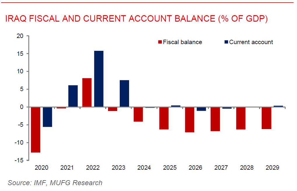 S&P affirms Iraq’s B- rating on rising oil output and strong reserves. S&P Global Ratings affirmed Iraq’s ratings at B- with a stable outlook, reflecting expectations that higher oil production in 2026 and continued spending restraint will help offset softer oil prices and elevated domestic and regional geopolitical risks. The agency projects oil output to rise as OPEC+ quotas ease and the Kirkuk-Ceyhan pipeline resumes exports, supporting average GDP growth of about 2% through 2029 after a contraction in 2025, even as Brent prices are assumed at around USD60/b in 2026. Lower oil prices are expected to push Iraq into small current account deficits in 2025-26, but international reserves are forecast to remain close to USD100bn, around 35% of GDP and well above external stability. Fiscal deficits are projected to stay moderate, averaging about 3% of GDP through 2029, constrained by capacity limits and the interim 1/12 spending rule following the November 2025 elections, while public debt is expected to rise gradually but remain manageable. Ratings remain constrained by weak institutions, high dependence on hydrocarbons, and ongoing US-Iran tensions, but supported by sizable reserves, low external debt, and a maintained exchange-rate peg to the US dollar.