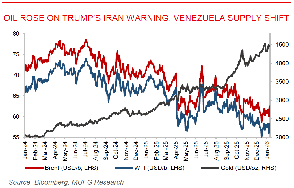 Oil rises on Trump’s Iran warning and Venezuela supply shift, despite glut fears. Oil extended its rally as traders weighed escalating geopolitical risks against expectations of a global supply glut later this year. WTI traded around USD58/b after jumping 3.2% yesterday, while Brent hovered near USD62, supported by President Trump’s warning that the US would hit Iran “hard” if unrest there turns violent. Sentiment was further lifted after Trump signalled support for a bipartisan bill targeting buyers of Russian crude, including China and India. Still, despite the strongest daily rally since October and a likely weekly gain, prices face medium-term pressure from an expected surplus. Markets are also digesting US’s efforts to reshape Venezuela’s energy sector, including talks between US officials and oil executives on rebuilding output, rising shipments by Chevron and renewed interest traders, developments that could redirect Venezuelan crude flows from China toward US refiners.