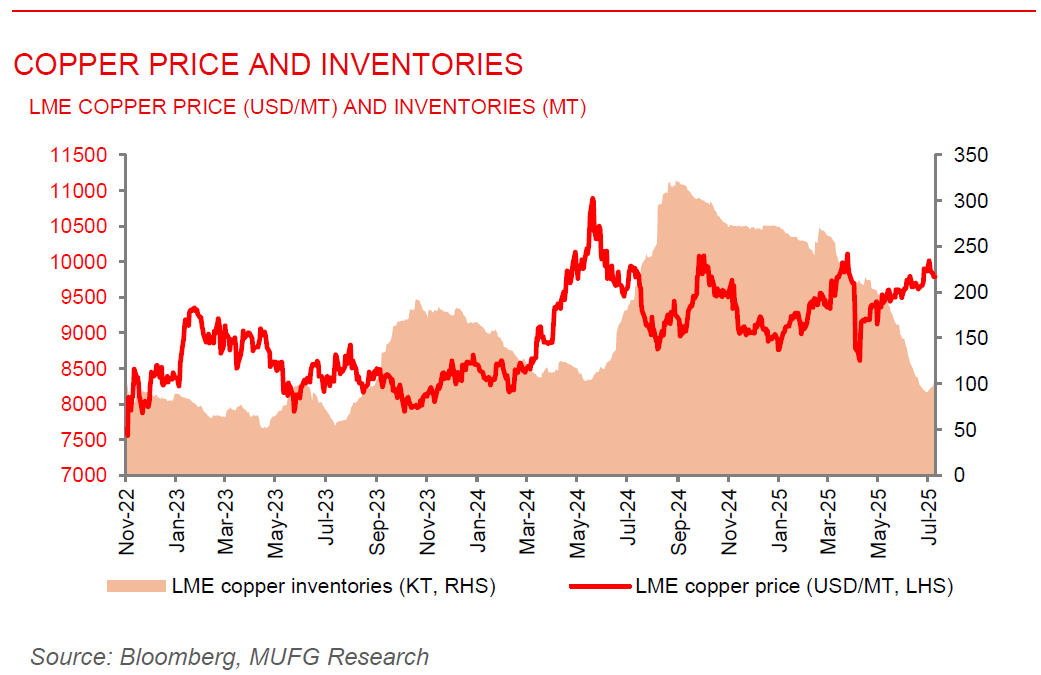 Oil holds steady as inventory surge and tariff risks cloud outlook. Oil prices stabilised near USD70 for Brent and USD68 for WTI as traders weighed a sharp 7.1 million barrel increase in US crude inventories, the biggest since January if confirmed, and the potential demand impact of President Trump’s escalating tariff agenda, including new copper duties. While a fragile Middle East truce has eased geopolitical tensions, attention has returned to US trade policy and OPEC+ supply increases. Weak drilling activity and falling rig counts in the US have led to a cut in production growth forecasts, but the oil market still faces the risk of shifting into surplus after summer demand peaks.